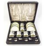 A superb STERLING SILVER mounted coffee can set with matched hallmarks and spoons for Sheffield 1934. Silversmiths Cooper Brothers. Cans and plates by George Jones. One saucer and two cans with historic crack marks but the set presents very well.