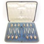 STERLING SILVER set of twelve teaspoons and matching sugar nips. Hallmarks for Sheffield 1935 makers Thomas Bradbury. Very nice condition in Glasgow Buchanan Street retailer's box. Total gross weight 195g approx.