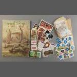 Small stamp album with content and loose cut stamps. Includes a small amount of tea, wizard etc. collectors cards.
