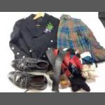 Highland dress jacket and a tartan kilt. Jacket measures 30" chest. Kilt has 34"-38" waist approx. Used as Wedding Dress jacket with floral buttonhole and kilt with Claymore kilt pin. Includes socks. flashes, brogues size 8 and two dress belts.