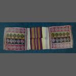 A well-used camel bag with historical darned repair. Pockets each 46 x 45cm approx. Total length 140cm
