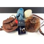 Highland wear accessories to include a leather sporran with Celtic knot design, a vintage cute fur sporran, a kilt pin set with mother of pearl, flashes and 2 pairs of kilt hose
