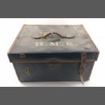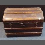 A useful and classy wood banded dome topped travel trunk with striped interior. Height 45cm, Width 67cm, Depth 45cm approx. In overall good condition.