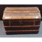 A useful and classy wood banded dome topped travel trunk with striped interior. Height 45cm, Width 67cm, Depth 45cm approx. In overall good condition.