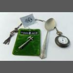 A small (3cm) steel cased fob watch on chain along with a Lauder Axe art pewter brooch and a spoon.