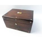 Attractive Mother of Pearl inlaid vanity box with contents. Hidden drawer to botton right side pops out nicely. 31 x 23 x 17 cm approx. Mirror and letter rack behind top lid, contents as shown. Crack to top lid and mother of pearl inlay but overall an attractive and appealing box just in need of a little love.