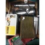 QUAKITY LOT! A mixed box to include a real vintage Viking travelling iron in its own tan leather case, plugs into a light socket, an A.R.C. Chesterton miniature iron 10cm long approx also plugs into light socket, a Civic white metal tea service comprising teapot, milk jug and sugar bowl (finial needs to be re-attached on teapot) etc