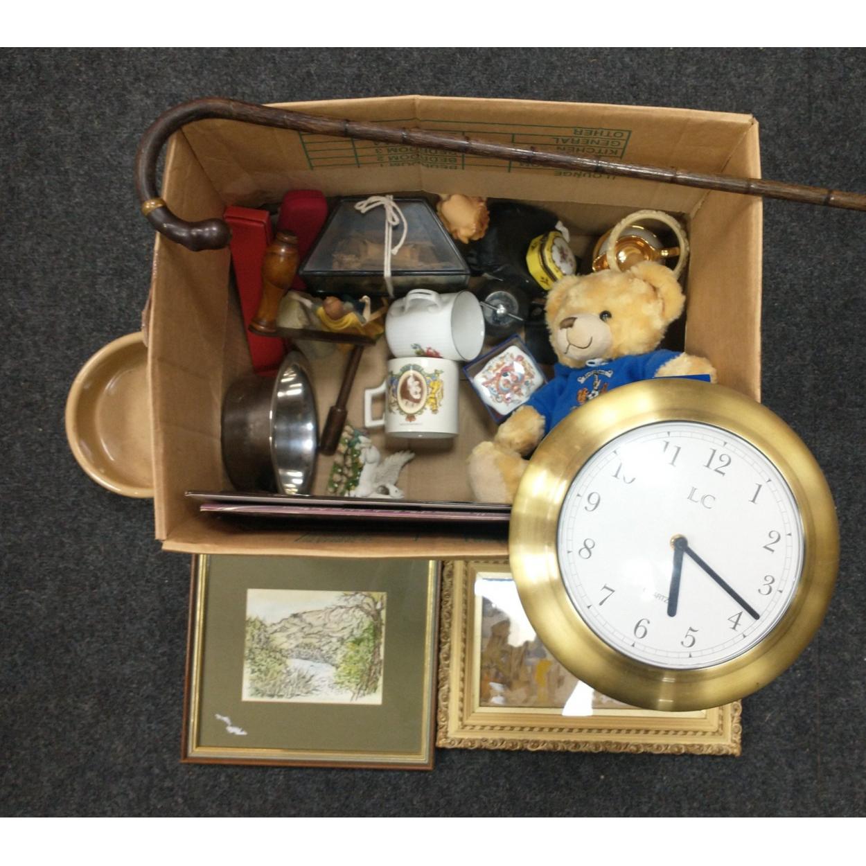 A mixed box to include a small LIMOGES trinket box, a Kilmarnock FC supporting teddy bear, a rubber carving in a glass cage (one pane damaged), various items of Royal commemorative ware, Lady of the Dragons Mountain Sorceress, Land of Myth's small Pegasus B, 2 dog bowls, LP - Nat King Cole at the Sands, LP - Molly Weir Down Memory Lane, costume jewellery including a necklace and bracelet set, a small black wooden fan (needs repair), a kitchen clock, a walking stick 87cm long)