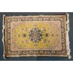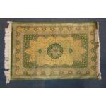 A silky Middle Eastern rug, complements the previous lot, in shades of yellow and green measures approx 78x120cm