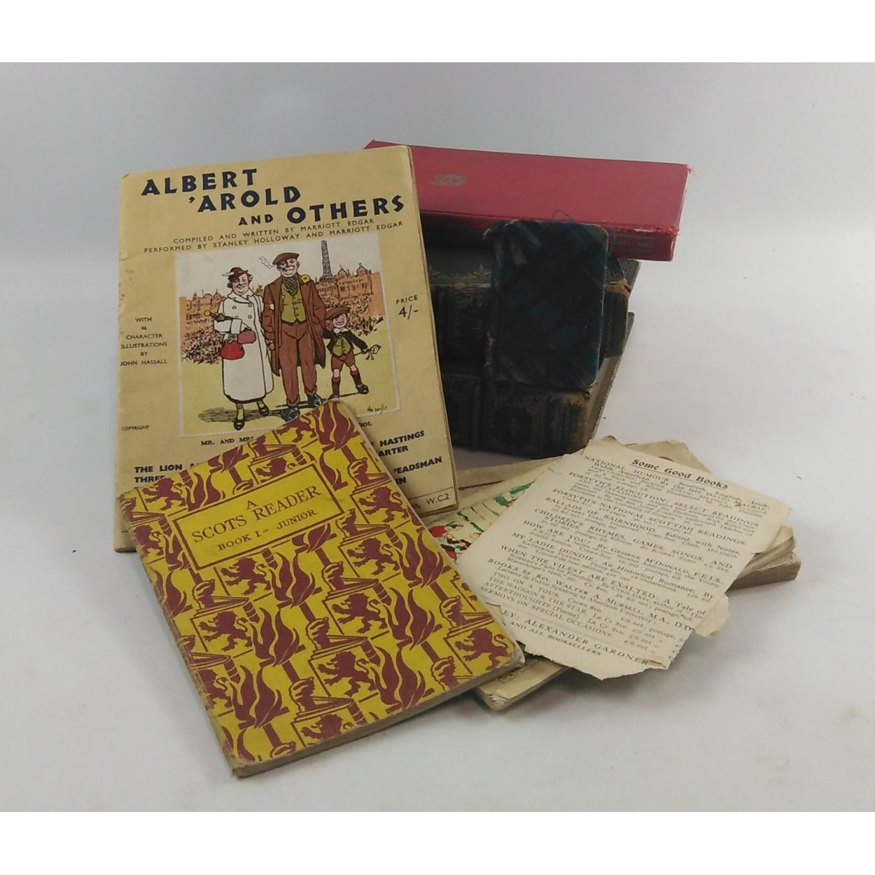 An eclectic mix of vintage books and pamphlets to include the ATORA BOOK OF OLDE TIME CHRISTMAS CUSTOMS, GAMES & RECIPES original 1930s edition, POPULAR SCOTCH READINGS edited by Robert Ford, published c 1930s, (cover in poor condition), ALBERT, 'AROLD AND OTHERS written by Marriott Edgar, performed by STANLEY HOLLOWAY, A SCOTS READER - BOOK 1 -JUNIOR from 1945, CURLING -PAST AND PRESENT by WA Creelman (Toronto 1950), 2 leather-bound volumes of the 'Life and Epistles of St Paul' published by Longman, Brown, Green, Longmans & Roberts 1858 and a mini-edition of OUR NATIVE SONGS edited by William Moodie