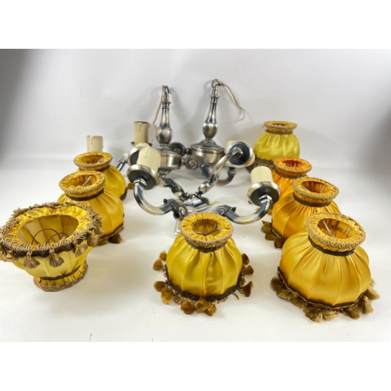 Two silver wall lights with mock candles and 2 centre lights all with gold coloured fabric shades