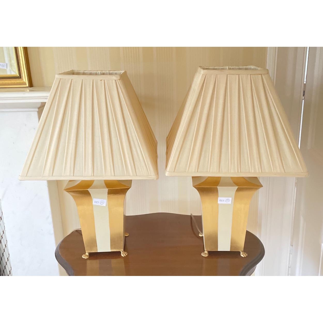 THE ULTIMATE IN QUALITY! A pair of lamps Purchased in MARY MAXWELL INTERIORS SHOP DUBLIN ST EDINBURGH designer table metal based lamps including shades - lamp bases are gilded with a central cream stripe - dimension including the shades 58cm tall