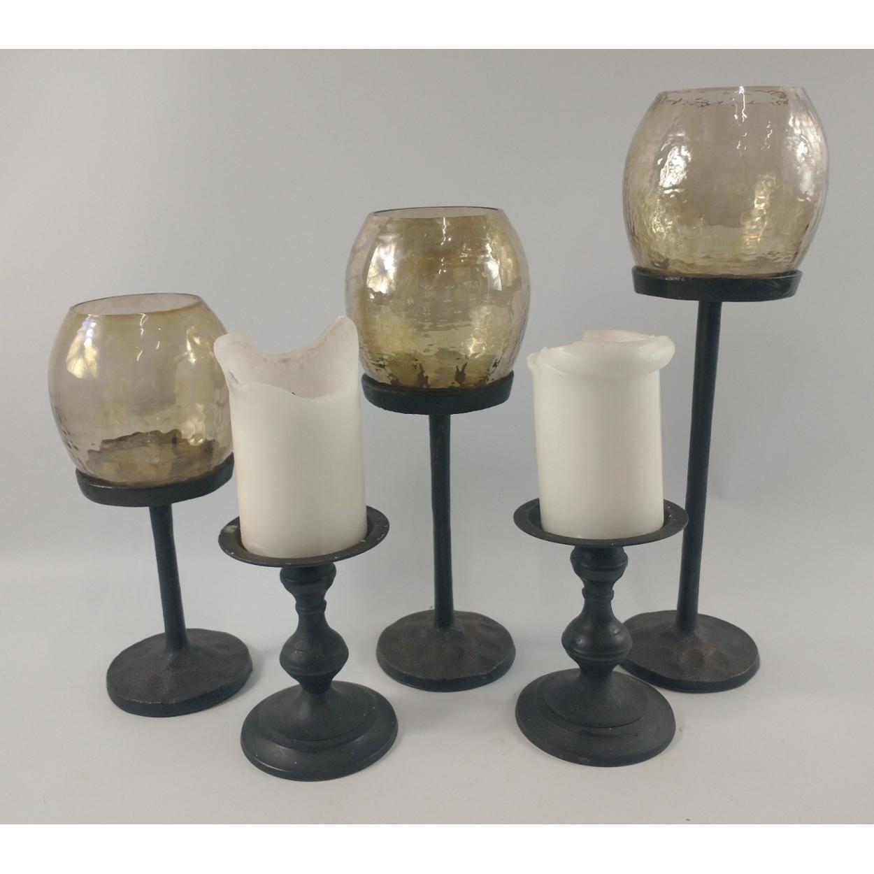 A selection of candle holders to include 3 with metal stems and glass shades ranging from 26-36cm in height, and 2 holders each 14cm high complete with candles