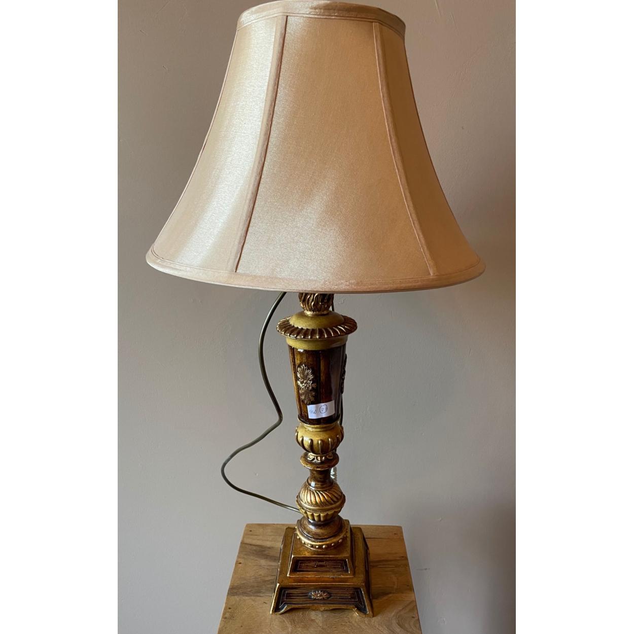 A nice quality gilded wooden table lamp in candle form with shade height 75cm approx