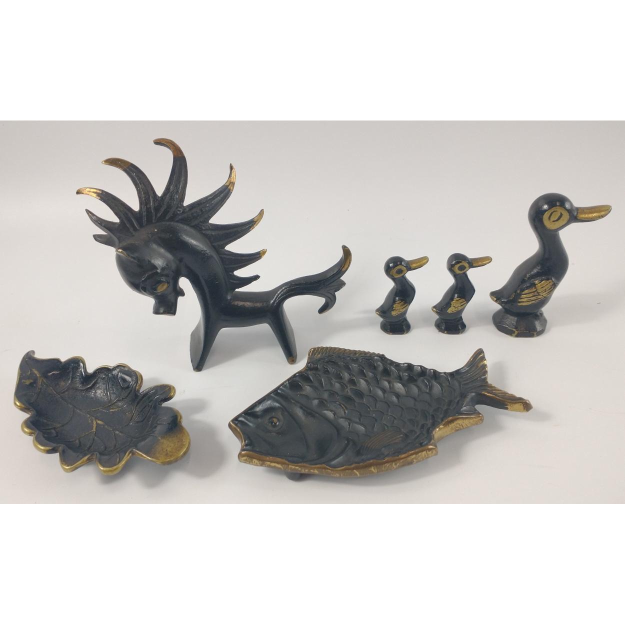 A FIREHORSE in brass with gold highlights (10cm high) inspired by WALTER BOSSE plus a brass fish (12cm), an oak leaf (10cm) and a happy duck family of Mum (7cm) and 2 ducklings each 4.5cm tall