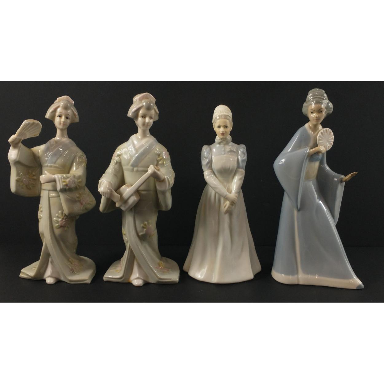 Three porcelain Oriental figures to include a Porcelanas Miquel Requena Valencia girl with fan (23cm) and 2 other ladies with no markings, plus a COALPORT Nurse from St Mary's Hospital London, Past and Present Nurses League diamond jubilee 1922-82 limited edition 764/1500