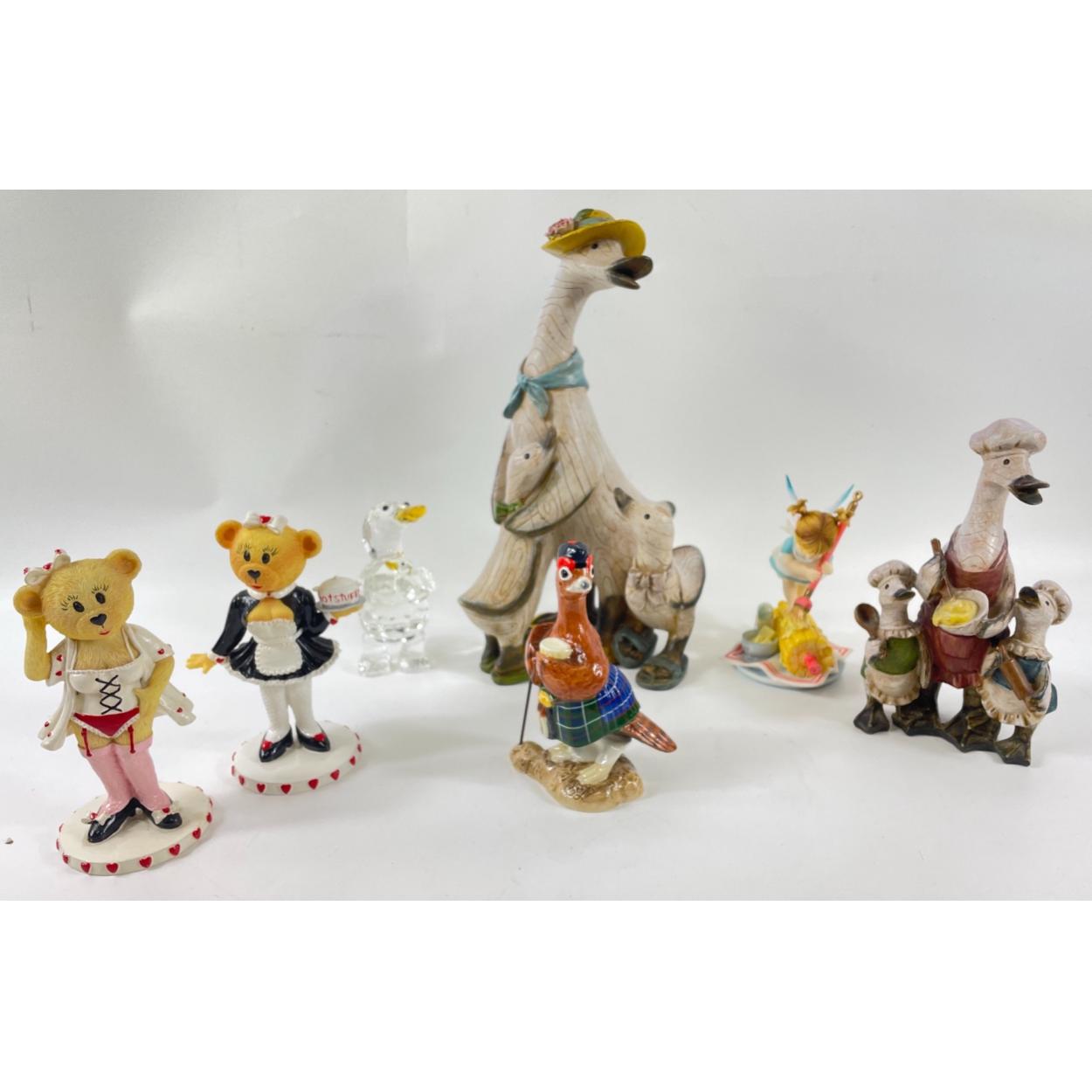 An interesting group of decorative figurines to include from the LITTLE KITCHEN FAIRIES collection - 'Corn-on-the-cob fairy (13cm high), a JOHN BESWICK signed 'Infamous Grouse' (13cm high), 2 'Naughty but Nice' and 'Hot Stuff' teddies (14cm tall), a threesome goose family (18cm high) a threesome (19cm tall), and one at 19cm tall, plus a glass mama duck and duckling (12cm tall)