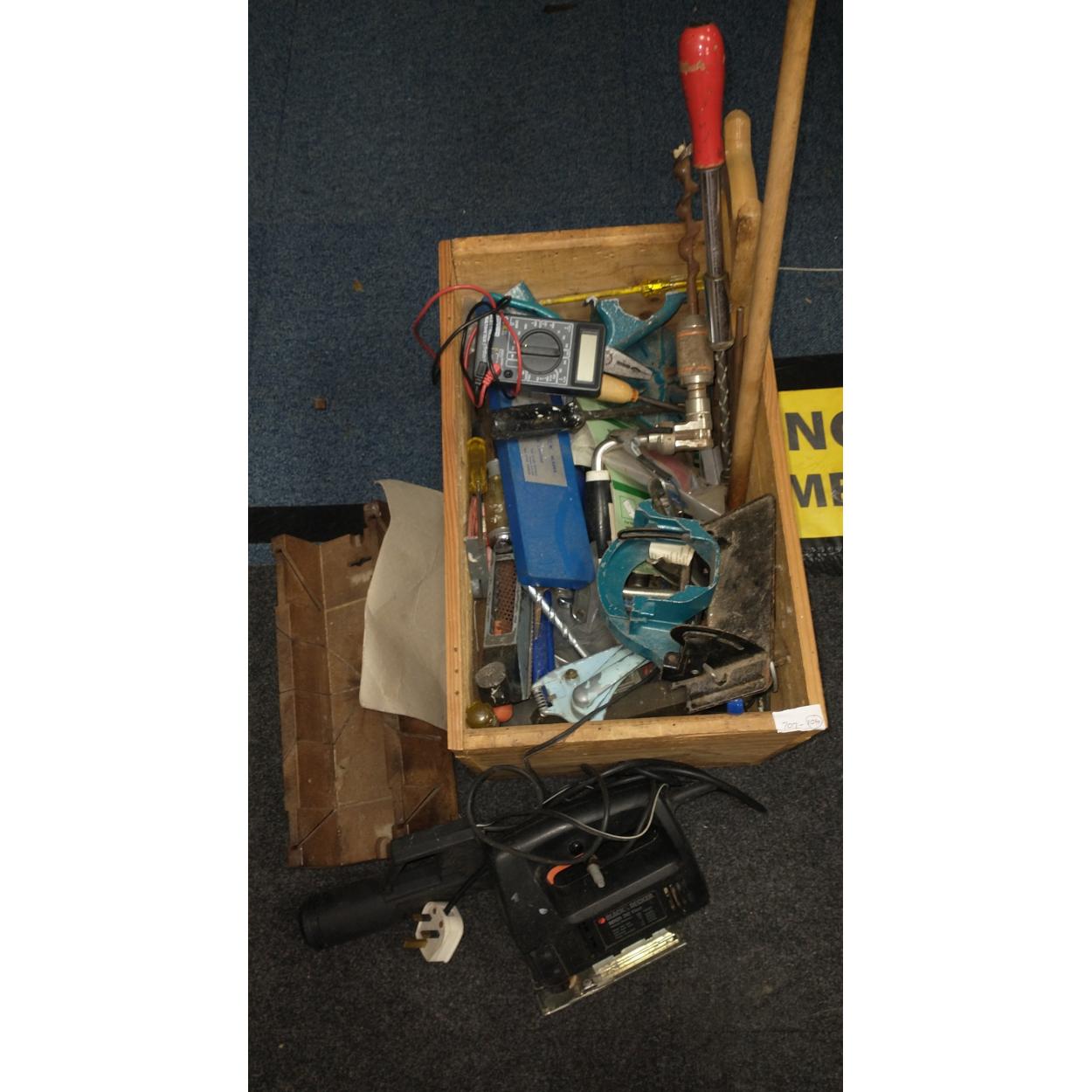Wooden crate containing selection of tools including long handled screwdriver and an electric meter tester etc
