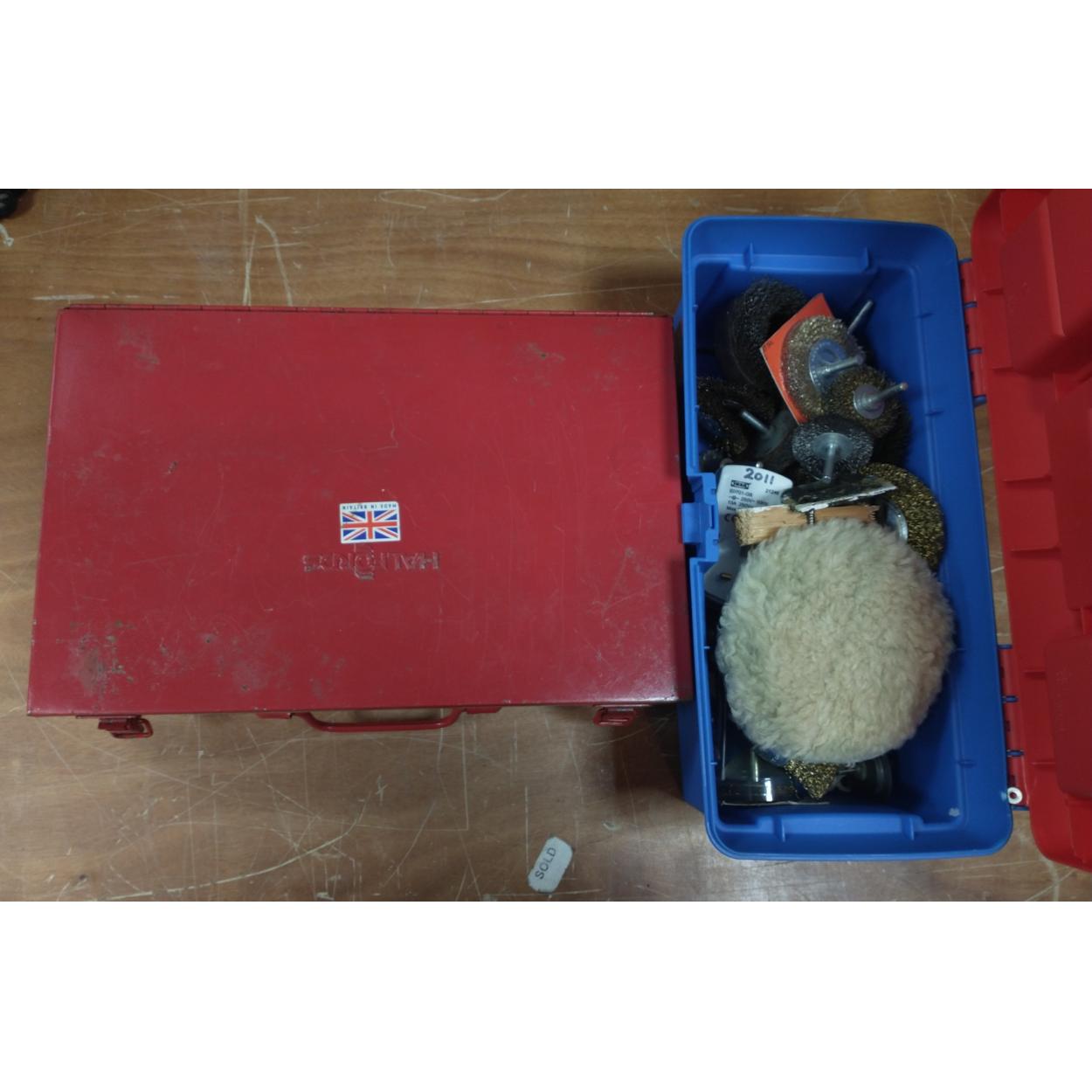 Red metal Halfords tool box (W:40cm) and child's toolbox with various sanding/grinding wheels and car buffing pads etc