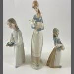 Three pieces of LLADRO comprising a signed girl with pig (17.5cm), girl with candle(model 4868) 22cm high, damage to candle and one hand, girl with lamb (28cm high)