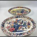 Two super large china platters one with a pair of birds and a carriage, the other with various birds each 46cm long, have been used as wall plaques.