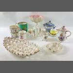 An attractive vintage square CROWN DEVON dish 23x23cm, a vintage MALING Peony Rose lustre bowl no 6561 (23cm), a vintage MALING Brocade oval shaped dish no 4586 (16cm), a WORCESTER black mustard Herbs plate (17cm), a SPODE COPELAND 'Spode's Glory' square plate 23x23cm, a vintage CARLTON WARE leaf dish 25cm long and another leaf plate 12cm long, a LIMOGES hexagonal plate with peony 25x25cm, from the MINTON Haddon Hall collection a sandwich plate 29cm long, flan dish 13.5cm dia, 2 trinket dishes 9.5cm, etc