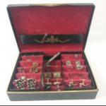 A black leather jewellery case, lined with red velvet with 2 swing out sections, holding a large selection of cuff links and tie pins measures 25x17x7cm