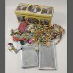 A tin full of costume jewellery, 3 ladies watches and 2 metal cigarette cases, one with inbuilt cigarette lighter