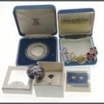 A box of mixed tie pins, lapel badges plus two each of commemorative crown coins to include Churchill 1965, the Queen's Silver jubilee 1977, and Charles and Diana's wedding 1981, plus one for the 50th anniversary of the Mini Cooper, and a small silver pendant stamped 925 of a spider in its web (gross weight 2g),