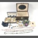 Jewellery box with a treaure trove within! Whole collection of various costume jewellery to include bling frog brooch, marcasite thistle brooch, rose quartz style necklace, polished stone necklace, unusual white metal cross, presentation case of 5 pairs of earrings and much more!