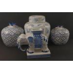An ORIENTAL lot of blue and white china to include 2 Thai lidded pots 13 and 15cm diameter, a lidded ginger jar signed to base 20cm tall, an attractive elephant flower vase approx 18cm long and 15cm tall