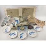 ORIENTAL china to include a large platter (31cm dia) by ONO Japan with a design of 2 cranes and 5 matching plates (15cm dia), an ornate plate with a bird pattern highlighted in gold (32cm width), a wooden box (10cm L) with an inlaid pattern on lid, a hollow glass egg with design of cranes 7cm long with stand and a padded presentation box, a square plate edged with gilt and design of lilies and blue leaves 15x15cm, a pair of Thai silk cushion covers plus 1 other and 2 silk paintings of ladies in kimonos (38x27cm)