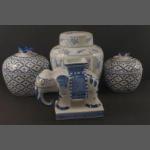 An ORIENTAL lot of blue and white china to include 2 Thai lidded pots 13 and 15cm diameter, a lidded ginger jar signed to base 20cm tall, an attractive elephant flower vase approx 18cm long and 15cm tall