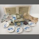 ORIENTAL china to include a large platter (31cm dia) by ONO Japan with a design of 2 cranes and 5 matching plates (15cm dia), an ornate plate with a bird pattern highlighted in gold (32cm width), a wooden box (10cm L) with an inlaid pattern on lid, a hollow glass egg with design of cranes 7cm long with stand and a padded presentation box, a square plate edged with gilt and design of lilies and blue leaves 15x15cm, a pair of Thai silk cushion covers plus 1 other and 2 silk paintings of ladies in kimonos (38x27cm)