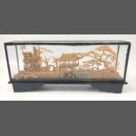 A Chinese cork tableau in a glass case with a scene of a pagoda, trees and bridges etc, case measures 23x10x5cm approx