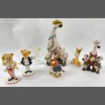 An interesting group of decorative figurines to include from the LITTLE KITCHEN FAIRIES collection - 'Corn-on-the-cob fairy (13cm high), a JOHN BESWICK signed 'Infamous Grouse' (13cm high), 2 'Naughty but Nice' and 'Hot Stuff' teddies (14cm tall), a threesome goose family (18cm high) a threesome (19cm tall), and one at 19cm tall, plus a glass mama duck and duckling (12cm tall)