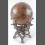 A beautiful large spherical wooden ball supported on a base of five camel-head legs carved from one piece of wood