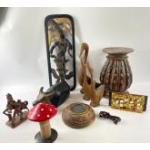 A box of mixed wooden items to include a carved water buffalo from Thailand, 3 swans ranging from 27-33cm high, a toadstool (17cm tall), a vivid tableau of man and horse (16cm high), a large candle or plant holder (30cm high), a short candle holder (5cm tall), a gold-painted Oriental tableau of a man on horseback being attacked by 2 other men (1910cm), a 50cm tall cut-out picture of a Balinese figure