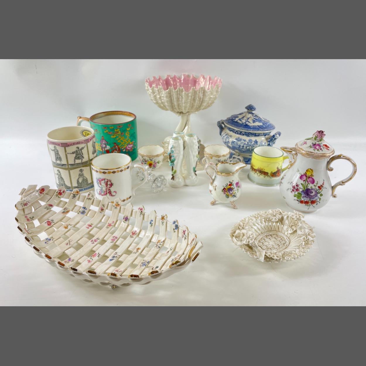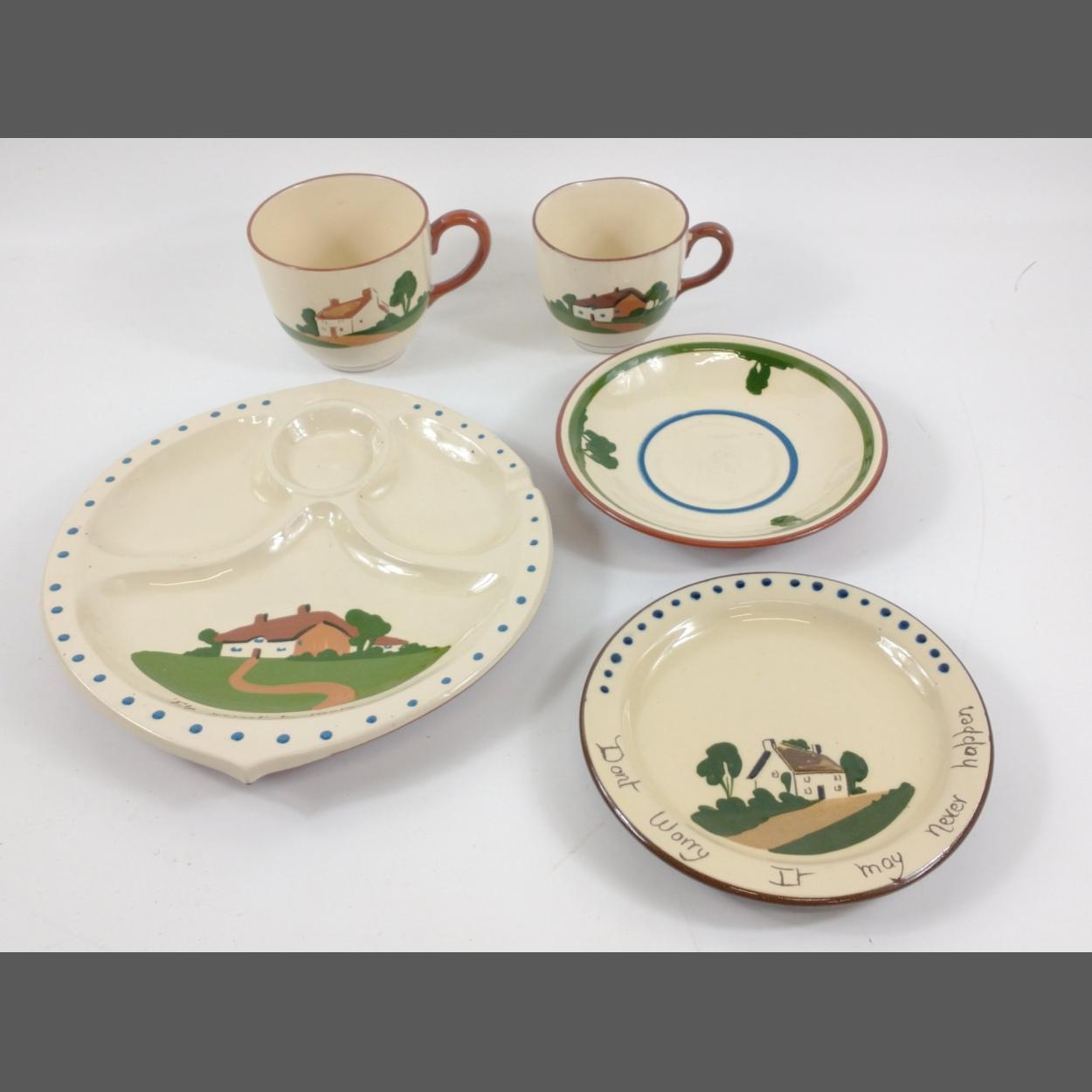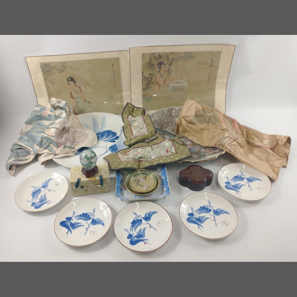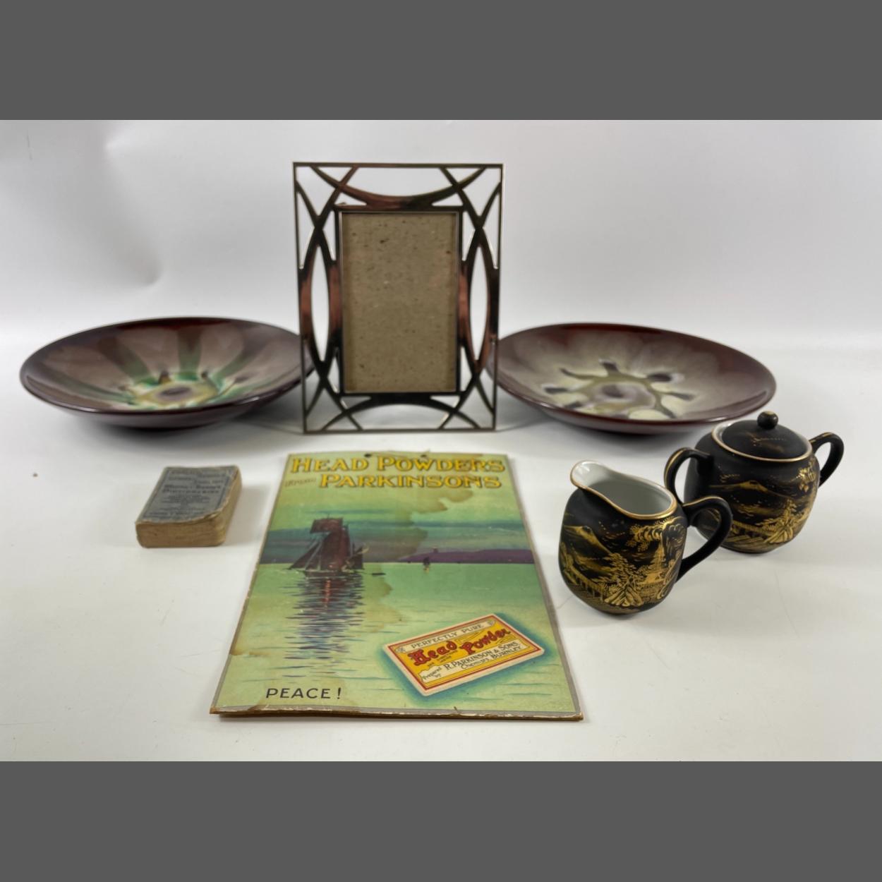A mixed box of 2 pottery bowls (26cm diameter), a 1940s shop advertising card advertising HEAD POWDERS from PARKINSONS (11x8cm), a small Oriental milk jug and sugar bowl in black with a gilt design of Mount Fuji, a white metal photo frame (for 6x4" picture), a USB plug and an English/German mini dictionary