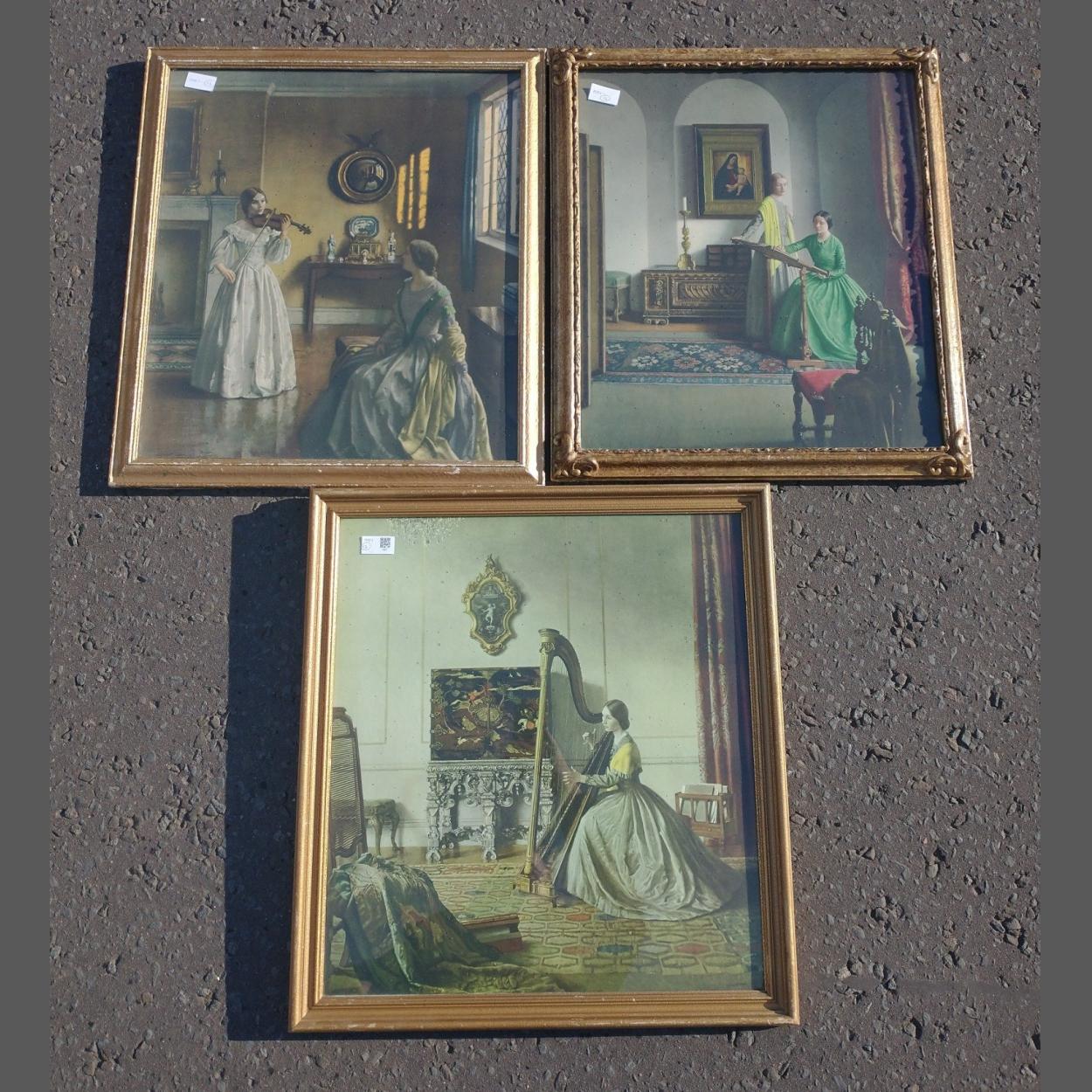 Three gilt framed Victorian scene prints of a young lady variously playing the violin (60x53cm) and harp (59x54cm) and also plying her embroidery (57x51cm),