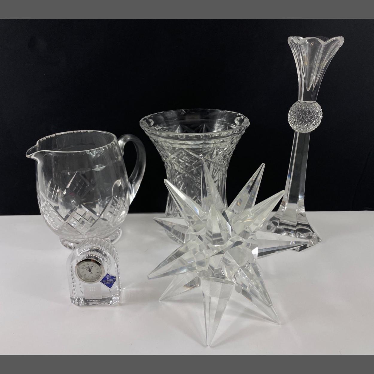 Collection of clocks to include a WATERFORD CRYSTAL clock standing 8cm high, an EDINBURGH CRYSTAL pyramid shaped clock standing at 9cm tall, a vintage SWIZA mantel clock 12 cm high, and a wooden-cased WESTCLOCK electric clock with brass inscription 'To Allan - Carluke Rovers Season 1961 - 62'