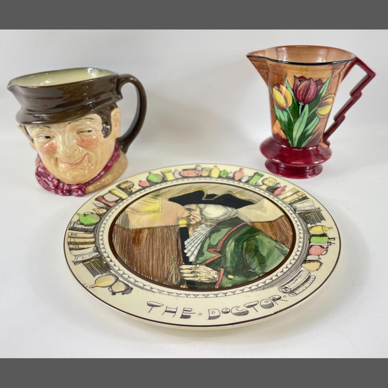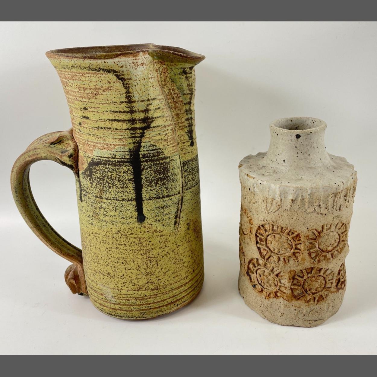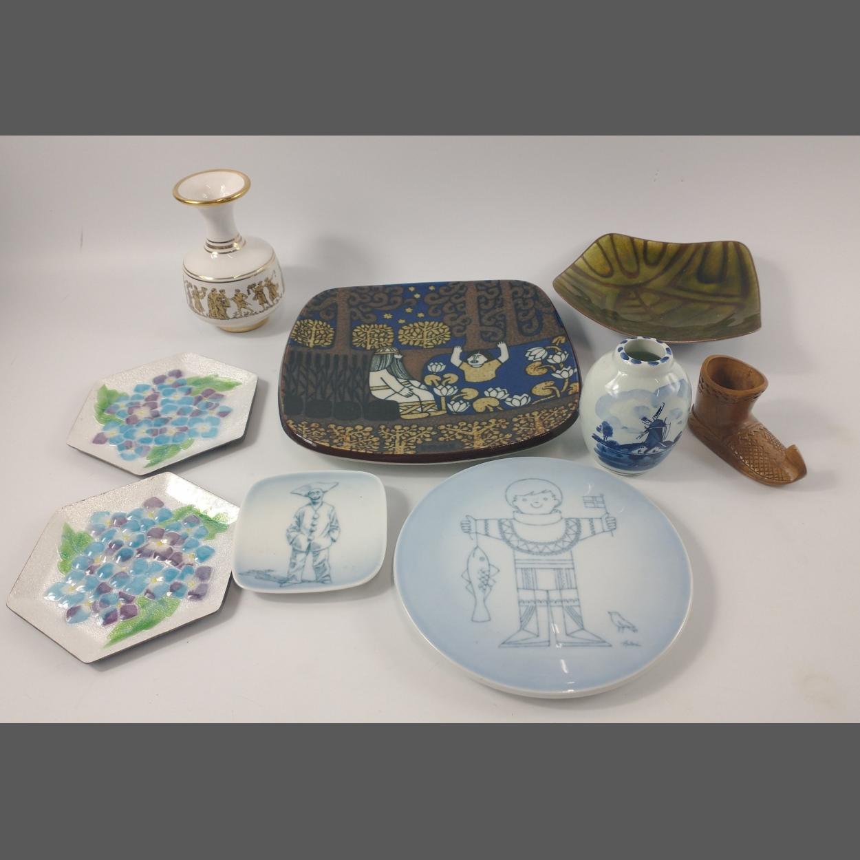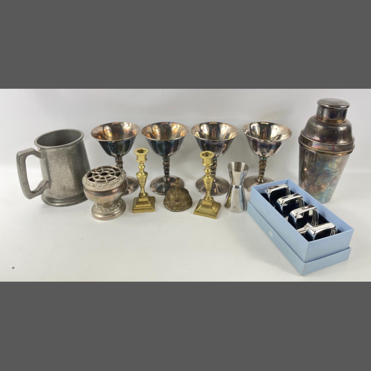 A mixed lot to include a STUDIO POTTERY plate (29cm dia) and jampot with lid, a DENBY twin-handled lidded soupbowl, 2 chopstick rests, a HORNSEA CONCEPT oil and vinegar combination, a CHARLES RENNIE MACKINTOSH pewter vase (15cm tall), a 35cm long leaf-shaped dish, a pair of brass Indian vases (30cm tall), a pair of 'No 1' vases (23cm tall) with some chips, a star-shaped glass dish (18x7cm), a boxed set of REYROLLE crackerjack nutcrackers