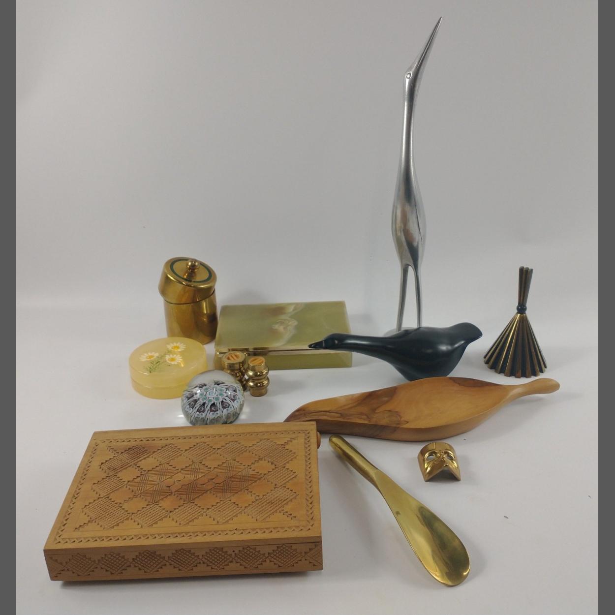 A mixed lot including a brass shoe horn (18cm long), an onyx cigarette box (suitable for playing cards) 15x10x4cm, an unusual carved wooden box 20x14x4cm, a brass bell13cm high, a Pearlite swan (20cm long), a stork (37cm high), a STRATHEARN paperweight (tiny chip) base 5cm etc