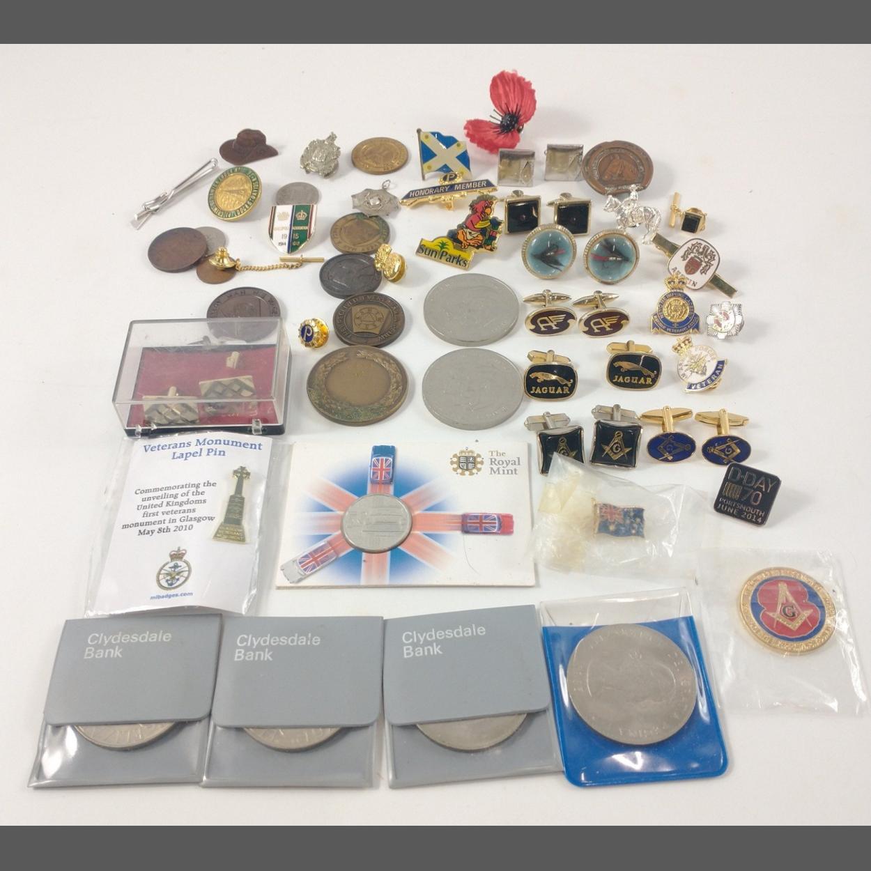 A box of mixed tie pins, lapel badges plus two each of commemorative crown coins to include Churchill 1965, the Queen's Silver jubilee 1977, and Charles and Diana's wedding 1981, plus one for the 50th anniversary of the Mini Cooper, and a small silver pendant stamped 925 of a spider in its web (gross weight 2g),