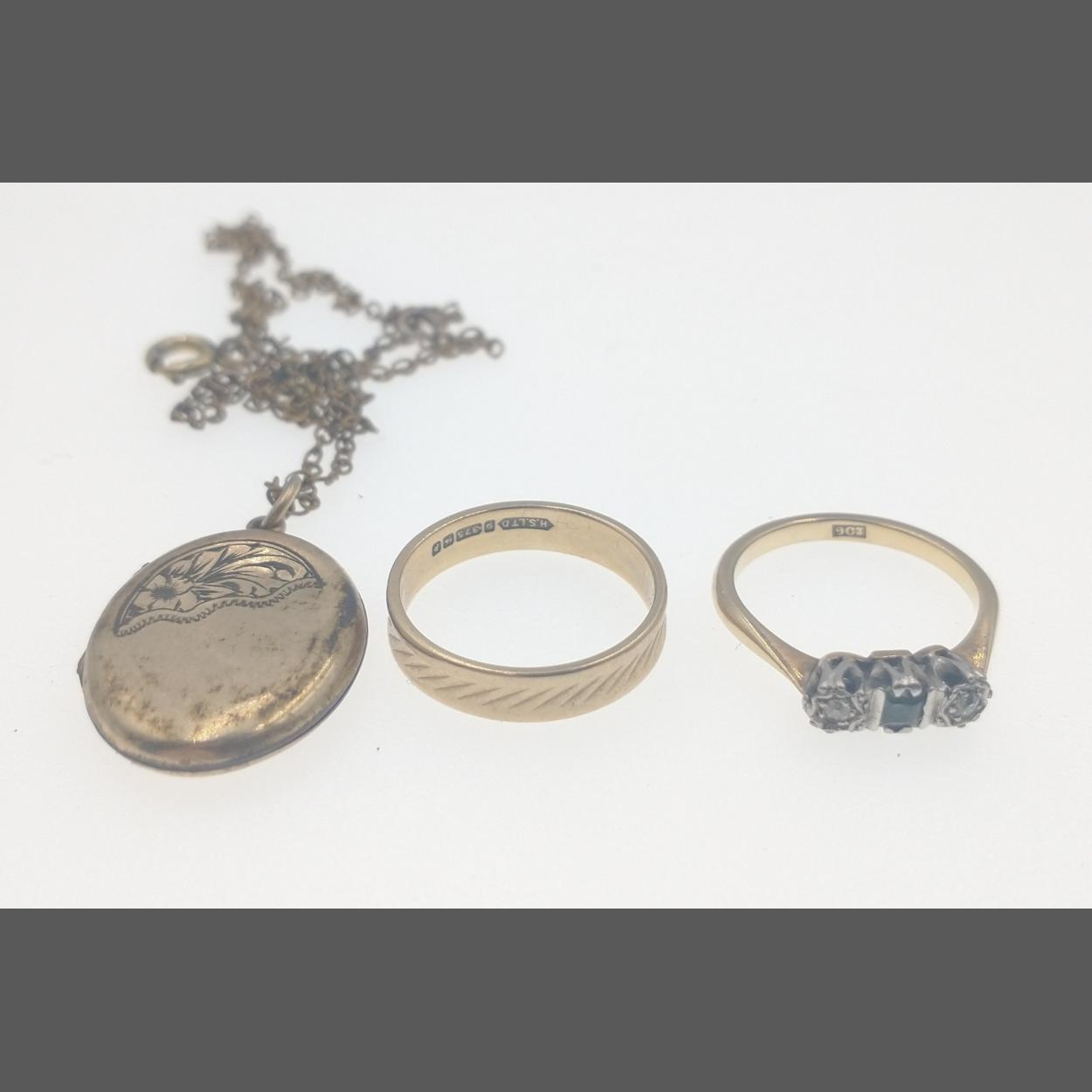 A 9ct hallmarked wedding band size L, gross weight 2g, plus a 9ct stamped ring with 2 diamonds (tested) size J/K, gross weight 1.5g and a rolled gold locket with chain