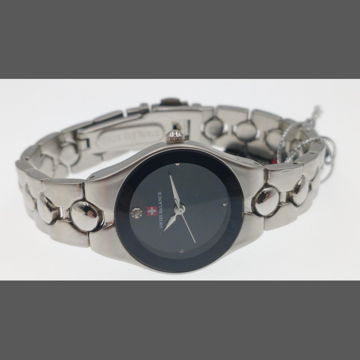SWISS BALANCE wrist watch in presentation case. Has black face (20mm wide approx) with metal dots at 3,6 and 9 and white stone at 12 position. Movement not working at time of entry but likely just needs new battery