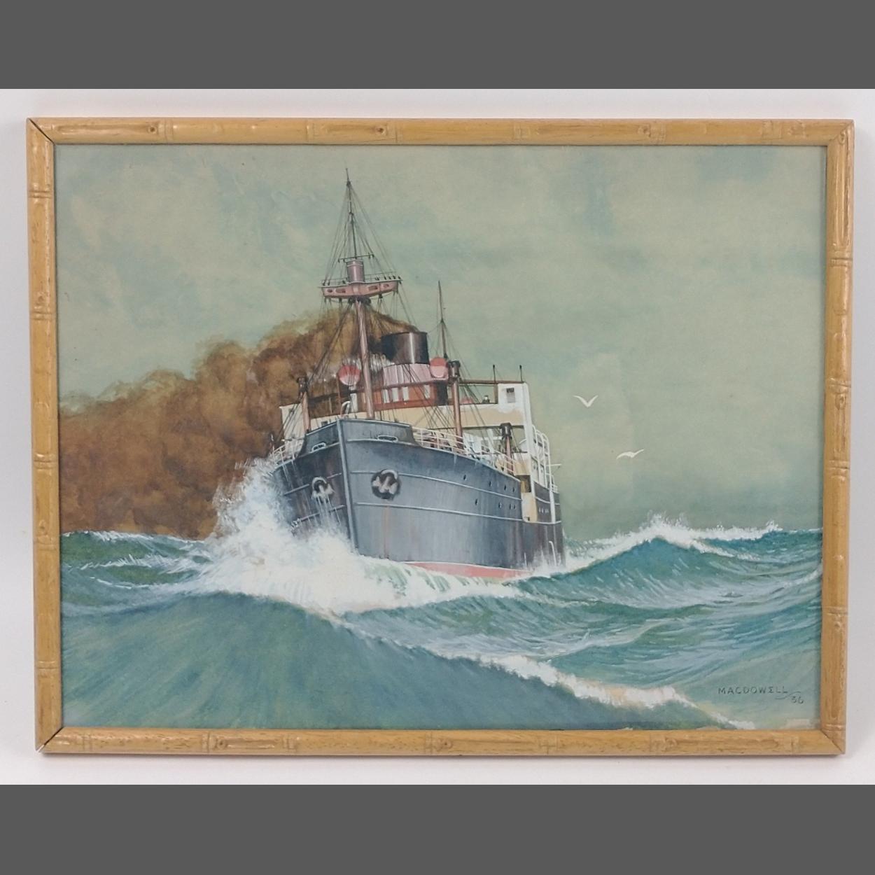 Framed watercolour of a fishing vessel signed MacDowell 1936 frame dimensions 14" x 11"