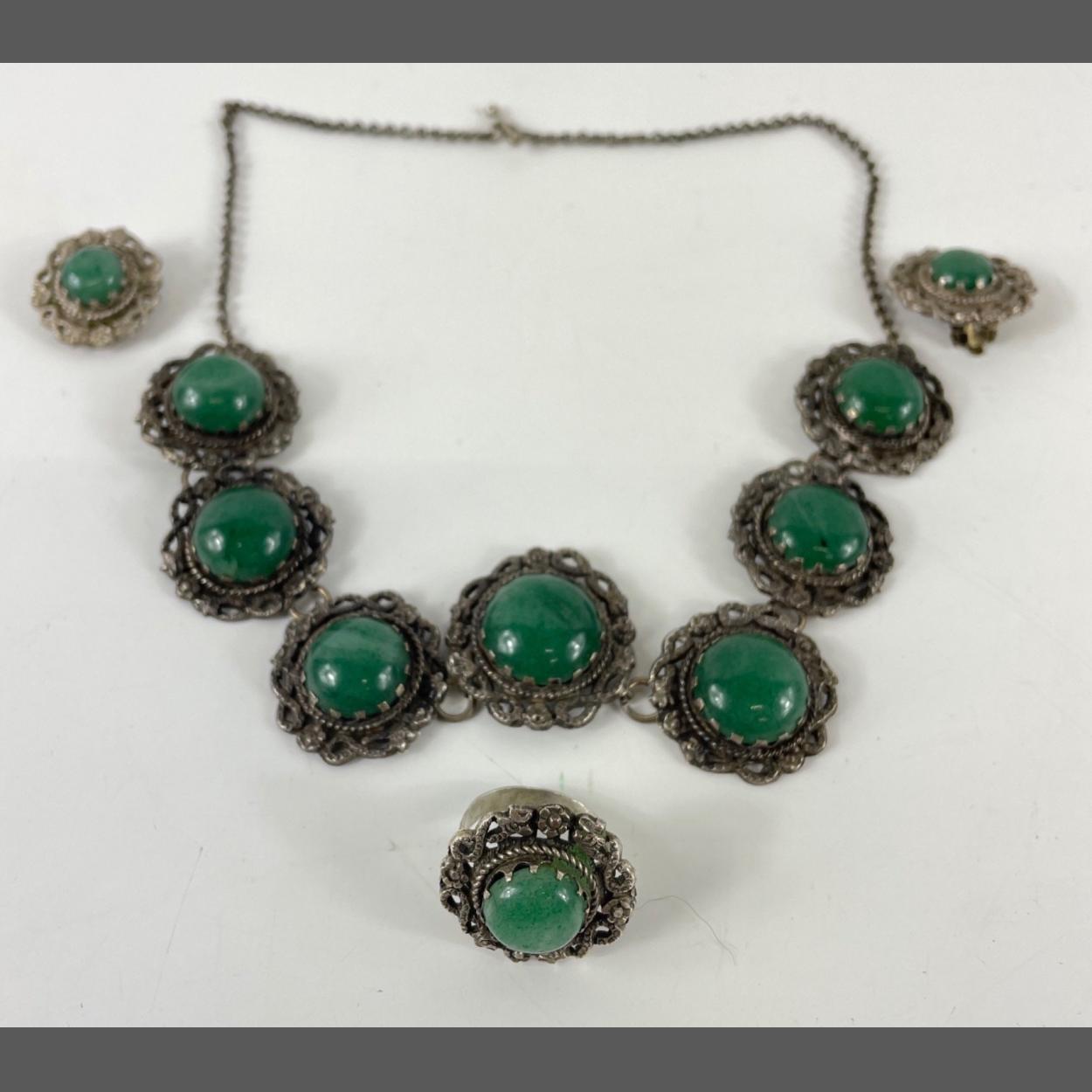 A c1950's intricately hand made white metal South African made necklace with clip-on earrings and ring set with beautiful green stones