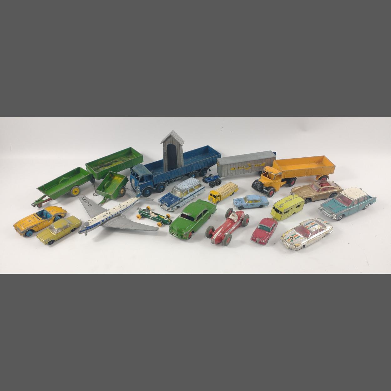 A bagful of vintage model cars to include a DINKY TOYS MASERATI 23N, a DINKY TOYS FORD SEDAN, a LESNEY JAGUAR 3.4 LITRE, a LESNEY no 23 BERKELEY CAVALIER caravan, a DINKY SUPERTOYS COMET in BOAC livery plus many more