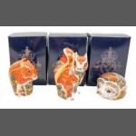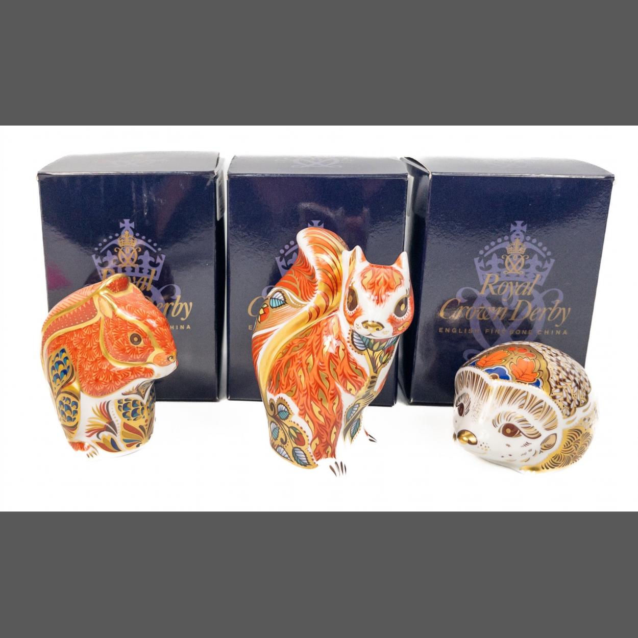 ROYAL CROWN DERBY Lovely Woodlands Creatures collection. Large Hedgehog Gold Button First Quality, Red Squirrel Gold Button First Quality, Woodland Squirrel Silver Button First Quality. Alll three items are boxed.